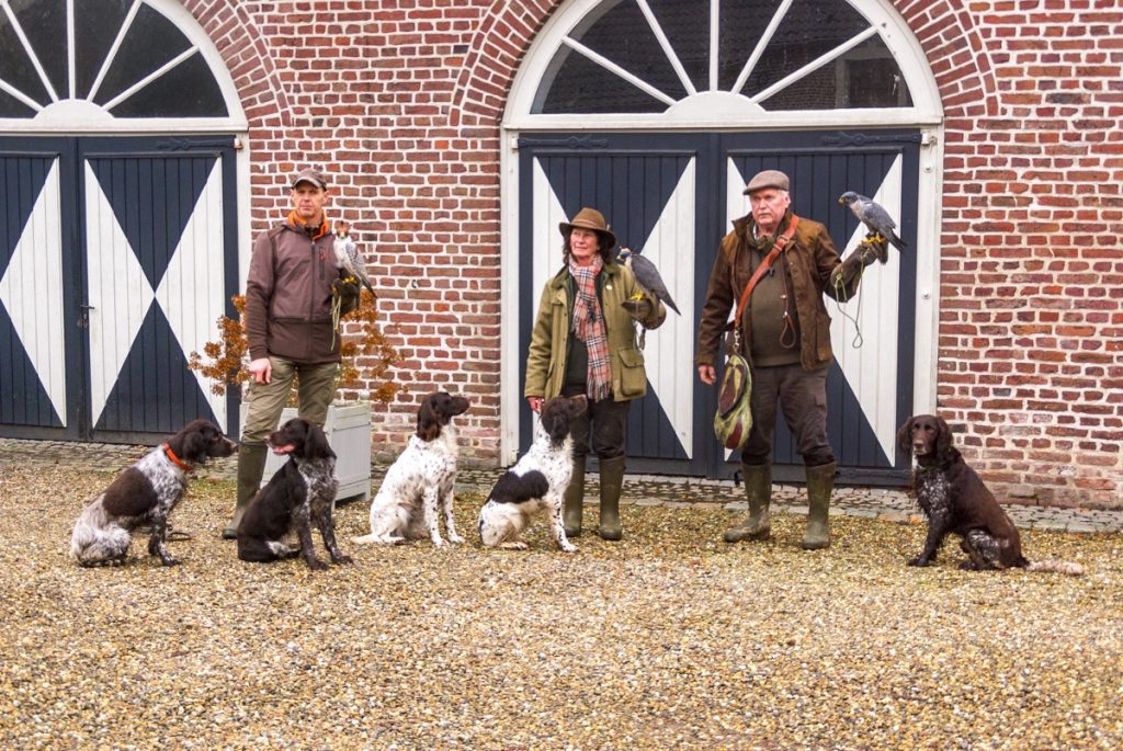 Valkeniers Hans en Wim Poelman (B) en ikke natuurlijk met slechtvalken en allemaal Chesannehof Heidewachtels. (van links naar rechts Kyra nakomeling van Petit, Bailey Nova, Wyatt Eline, Imara Matice, Miitos Bailey.
